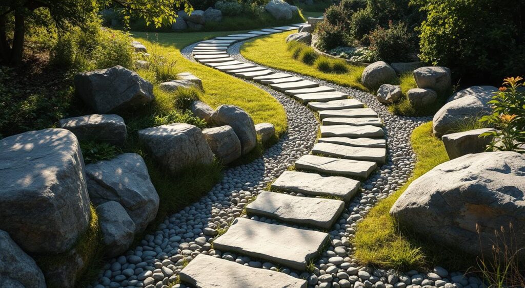 • Pedras rústicas (como ardósia): ótimas para caminhos mais naturais.